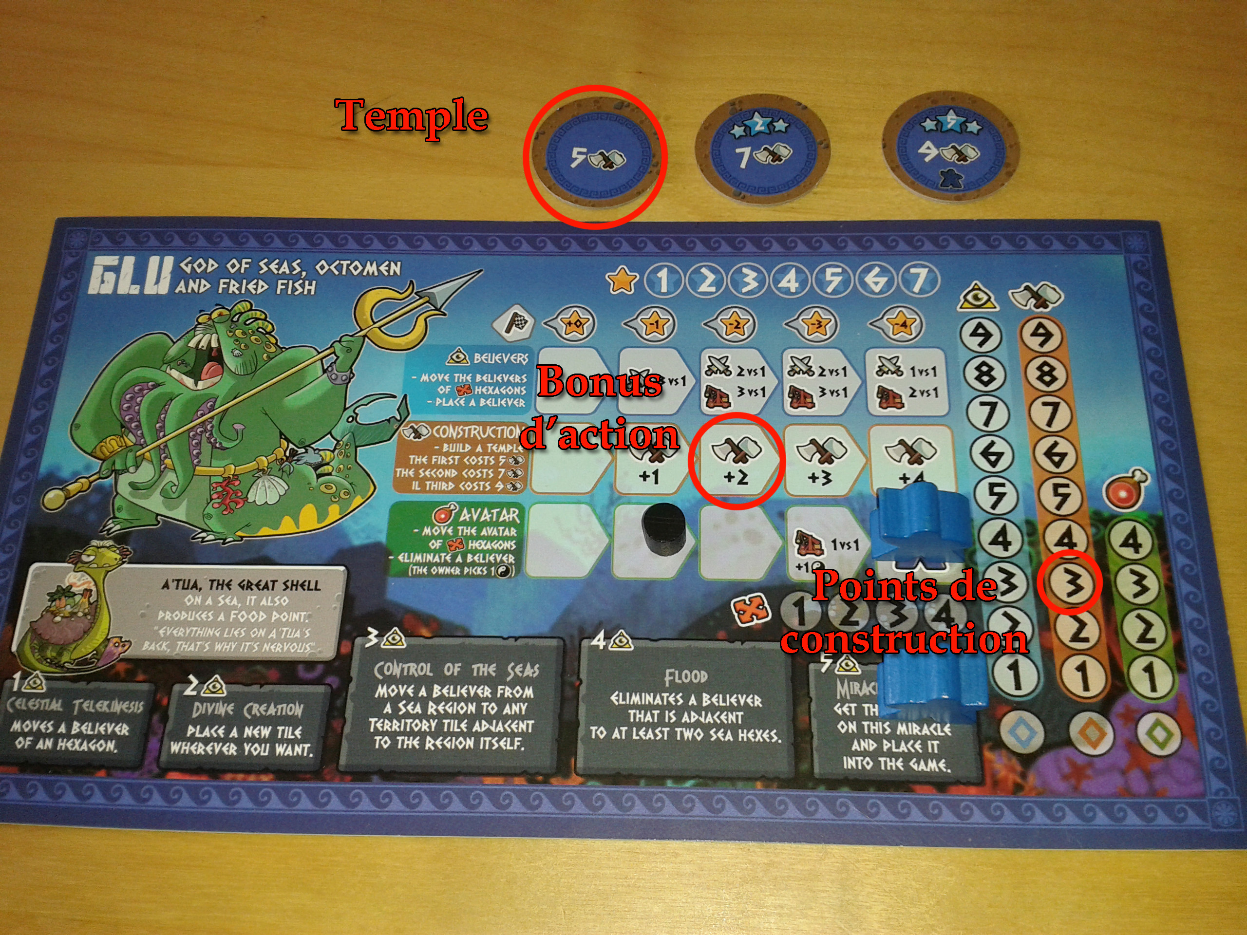 Le plateau personnel, c’est là que tout se passe ! Pour construire le premier temple (en haut), il vous faut 3 points de constructions et un bonus d’action de +2. Des questions ?