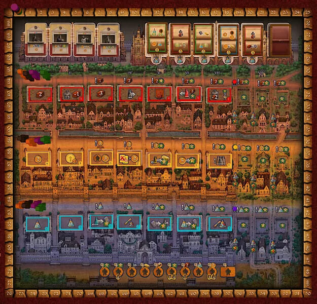 Comme dans Coimbra, la couleur de la bille vous permettra en fin de manche de faire avancer vos maîtres sur des pistes de la ville, cela aura son importance, car si un de vos golems dépasse un de vos maîtres, cela veut dire que vous en avez perdu le contrôle et là c’est la catastrophe ! Il va falloir le détruire, à moins que ça ne soit lui qui vous détruise… (aka perte de points de victoire probable).