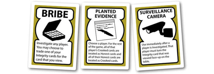 Les cartes intégrité de chaque joueur déterminent les rôles que vont endosser les joueurs : les flics honnêtes (leur chef est l'Agent) ou les corrompus (leur chef est le Caïd).