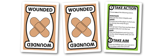 Sinon, vous pouvez piochez une carte Equipement. Elles peuvent être utilisées à n'importe quel moment à moins qu'autre chose ne soit indiqué sur la carte. Ça peut être utile, par exemple, vous avez des cartes Détecteur de Métaux qui permettent d'enquêter sur les joueurs qui tiennent un pistolet, le Taser qui permet de voler un pistolet à n'importe quel joueur, ou encore l'Eclair Aveuglant qui permet de mélanger ses cartes Intégrité et de les poser comme on veut.