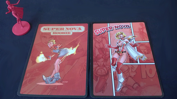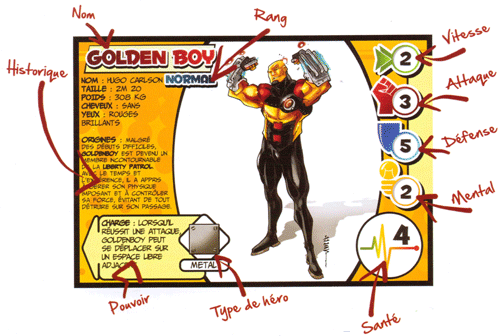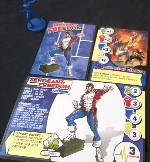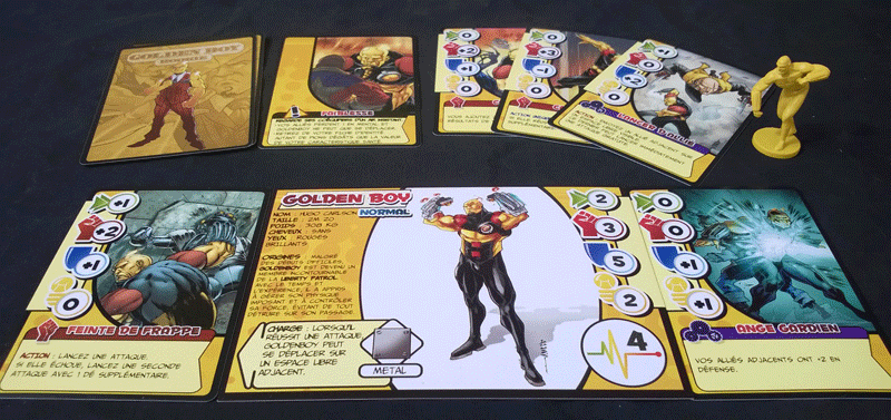 Vous l’avez remarqué, chaque personnage à sa fiche d’identité qui récapitule ses valeurs. Cette fiche, c’est un peu votre plateau de bord. A votre tour, c’est à droite et à gauche de cette fiche que vous poserez votre carte pouvoir. Une autre belle idée du jeu, vous allez voir.