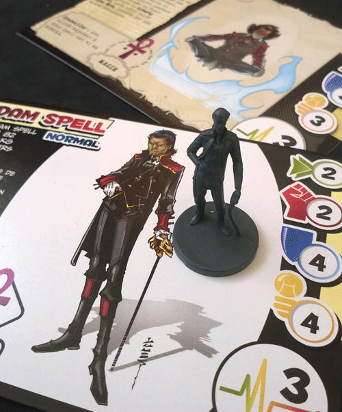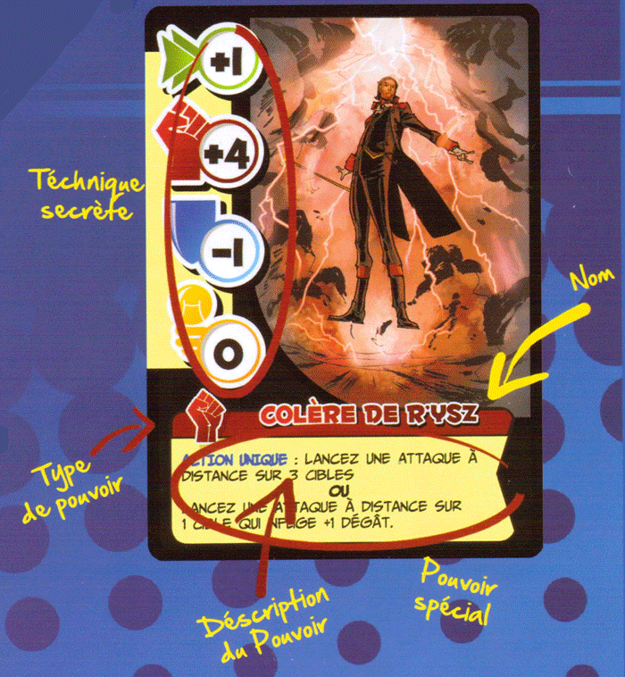 Le pouvoir spécial sera déclenché si vous jouez votre carte à gauche de votre fiche. Si vous placez la carte à droite, on prendra en compte les valeurs (ce qu’ils appellent la technique secrète) pour les ajouter aux valeurs de base (déplacement, attaque, défense, mental) du héros.