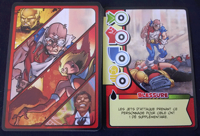 Si vous avez pris plus de dégâts que votre nombre de points de vie, ça va mal. Vous aurez à ajouter une carte Blessure (photo ci-dessus) en main : elles ont le même dos que les autres cartes pouvoir, d’ailleurs, elles ont aussi une sorte de pouvoir… mais négatif cette fois. Il faudra pourtant que vous la jouiez à un moment ou à un autre, histoire de plus les avoir en main, et oui… car un héros meurt s’il possède 3 cartes blessure en main ! Dilemme ! Quand est-ce que je vais pouvoir me permettre de la jouer…