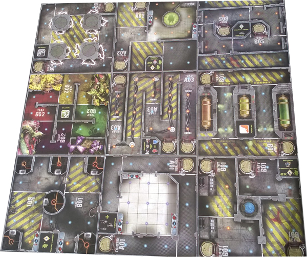 Chaque tuile représente une salle. Soit on suit le scénar’ pour créer le plateau, soit si on sent d’humeur créative, on invente sa propre mission (il y a des règles très utiles pour une installation rapide). Sur une tuile, vous avez des zones délimitées par les murs, des points de couleur où vont se placer les personnages, et quand le point est orange par exemple, cela signifie qu’il y a une interaction possible avec un élément du décor), des points de renfort (où popent les sbires), des pièges et des objectifs.