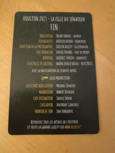 On notera le parti pris éditorial de nous plonger au cœur d’un épisode de série. Les premières cartes temps révélées (ne vous inquiétez pas, rien d’important ne sera divulgâché) à la manière d’un générique d’ouverture nous présentent les auteurs se trouvant derrière le jeu. À noter que la dernière carte récit que l’on est amené à consulter représente le générique long et nous présente l’équipe complète comme une équipe technique de réalisation de film/série. En plus de (presque) nous faire entendre le son généré par une plateforme de streaming au lancement d’un épisode, cela met un coup de projecteur sur le monde qui se trouve derrière le jeu participant ainsi à la reconnaissance du jeu comme objet culturel.