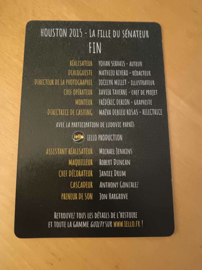 J’ai hâte de découvrir le reste de la collection et j’espère fortement que le scénario Houston 2015 aura une suite directe car de nouvelles questions autour de la famille de la victime sont posées à l’issue de la résolution de l’affaire et restent en suspens. Cependant je doute que mon désir ne se réalise dans le sens où le jeu propose trois fins alternatives selon comment nous avons résolu, et qu’une des fins (pour les avoir toutes consultées) clos définitivement le sujet ! Alors j’attends avec impatience la suite de la gamme ! Ça sera pour mai prochain avec le scénario Monaco 1955.