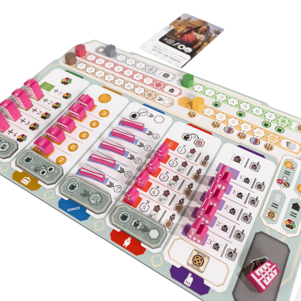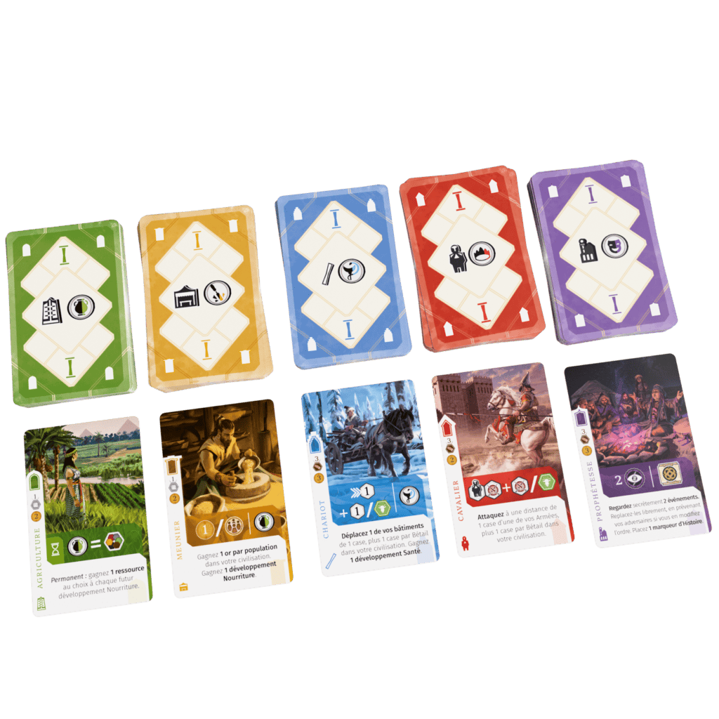 La seconde grande intention était de rendre visible l’empreinte laissée par chaque joueur dans l’histoire. Cette trace devait être lisible immédiatement et influencer à la fois les moyens et les choix de fin de partie. Elle se matérialise sous quatre formes : l’évolution du plateau joueur, les cartes jouées qui reflètent les grandes orientations stratégiques, les bâtiments placés sur le plateau central qui illustrent l’expansion physique, et enfin la frise historique sur laquelle chaque joueur inscrit durablement ses actions à travers les âges.