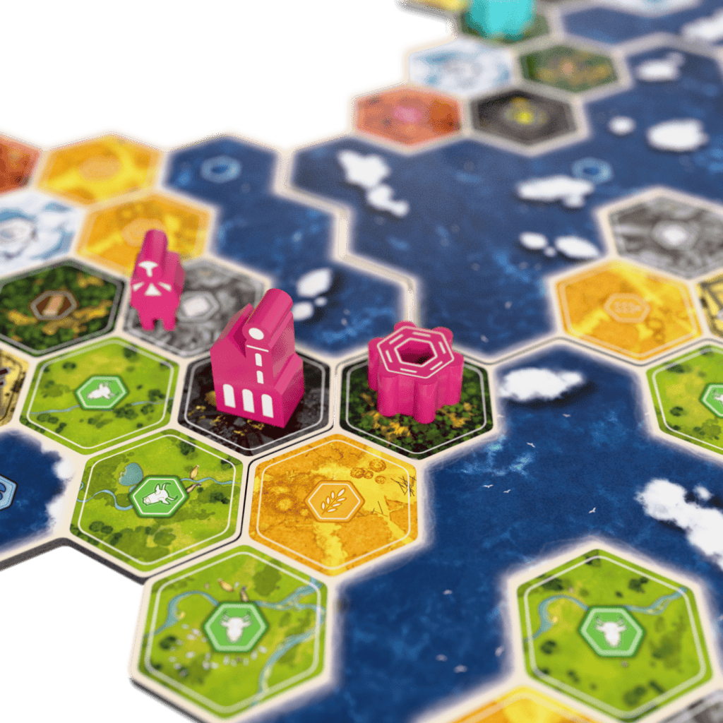 À cela s’ajoutent d’autres classiques, parfois très différents, comme Terraforming Mars, Small World, Concordia, Terra Mystica ou Brass, dont certains éléments se retrouvent, consciemment ou non, dans Near.