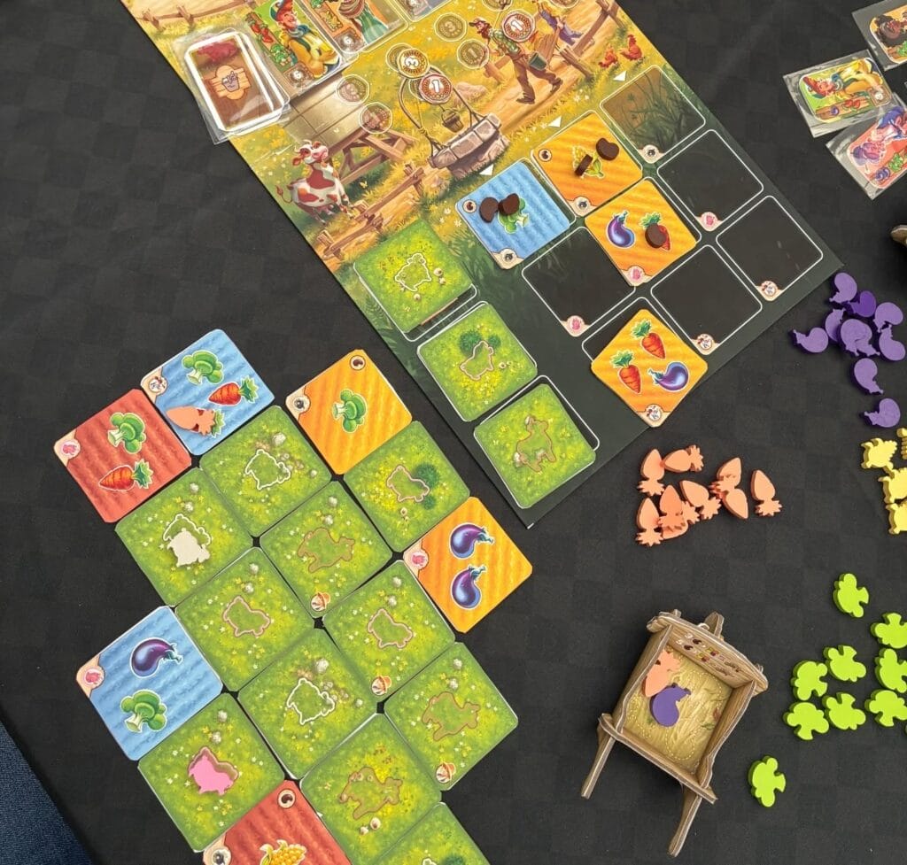 Y.L : Sunfield Farm, c’est un jeu de gestion familial où les joueurs incarnent des fermiers. Vous allez cultiver des légumes, élever des animaux et répondre à des commandes de clients. Le cœur du jeu repose sur un système de tableau building formé par des champs que l’on développe, par un système d’adjacence et de couleur, cela permet de planter et de récolter différents types de légumes. La partie dure environ 45 minutes, accessible à tous, mais avec un module optionnel pour un niveau de jeu plus avancé. C’est un puzzle game avec une ambiance cosy. Chaque joueur gère sa petite ferme, tout en interagissant avec les autres joueurs par le plateau central et la course pour livrer les meilleurs clients et remplir les objectifs en premier. Les illustrations de Cyril Bertin donnent au jeu une superbe esthétique, avec des mignons petits meeple légumes et animaux.
