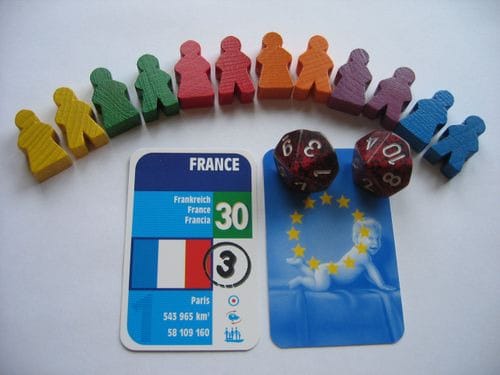 La société allemande en effet a réussi à enregistrer la marque pour l’UE qu’en 2019 en s’appuyant sur le fait que la figurine utilisée dans Carcassonne était considérée comme le « Meeple original ». Pourtant, de nombreux éditeurs et jeux de société portent « Meeple » dans leur nom (Meeple Circus, Meeple War, Meeple Land, Terror in Meeple City, etc) car le mot est rentré dans le langage courant des ludistes du monde entier. D’ailleurs, même la forme physique d’un Meeple (pièce de bois colorée en forme de personne) aurait été créée pour la première fois pour le jeu Europa 1945-2030 (1998) publié par Descartes Editeur (un jeu de Leo Colovini & Duccio Vitale ; image ci-dessous).