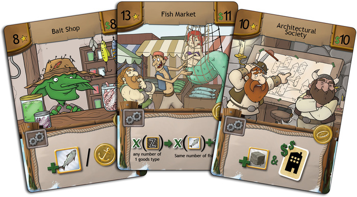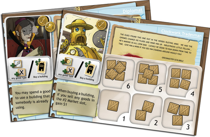 Chaque joueur incarne un entrepreneur qui possède un bâtiment de base, un pouvoir spécial (qui permet de déroger aux règles) et un entrepôt pour stocker entre une et 6 ressources (du bois, de la pierre, du poisson et de la viande).