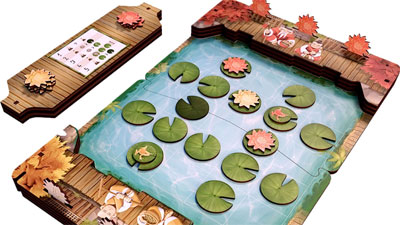 Alors prends place et écoute petit scarabée. Chaque jardinier dispose de huit boutons de fleurs numérotés de 1 à 8, et trois de ces bourgeons seront disponibles à chaque tour. Seize feuilles de nénuphars sont placées dans le bassin de 5×5 cases, et l’une d’elle sera tournée sur son côté obscure de sa force. On en parle peu, mais les nénuphars ont un côté diabolique. Vous allez voir.