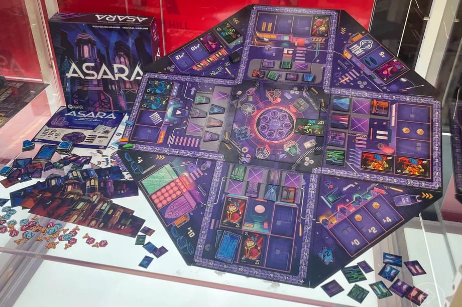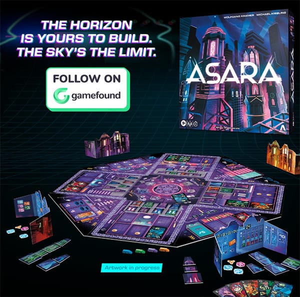 Avec ce premier projet Gamefound, pas d’accord d’exclusivité, ni conditions spéciales – pour le moment en tout cas. Le jeu concerné s’appelle Asara. Ce nom vous dit peut-être quelque chose, puisqu’il s’agit d’un vieux Kramer & Kiesling (2010, nommé au Spiel à l’époque) qui sera remis au goût du jour. Dans la première édition, il s’agissait de construire des tours dans un décor médiéval ; désormais ce jeu de pose d’ouvriers vous proposera d’ériger des tours futuristes neonlit. Le projet sera porté par la maison Avalon Hill (division de la société Wizards of the Coast, elle-même division de la société Hasbro) qui a déjà présenté (en vitrine & démo) son proto lors de la dernière Gen Con (photo ci-dessous).