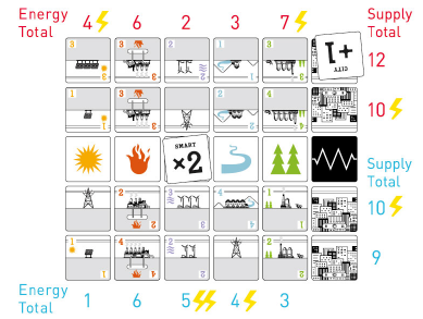 On calcule ensuite le total d’approvisionnement de la ville en additionnant la production de toutes les centrales électriques de la ligne. Il faut atteindre 10 pour gagner un point. Attention, si le total d’approvisionnement est de 8 ou moins, vous perdrez 1 point.