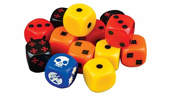 Pour ce faire, vous lancez un dé bleu plus vos dés d’attaque. Ces derniers déterminent si vous réussissez à vaincre les monstres, tandis que le dé bleu peut produire un certain nombre d’effets particuliers tels que le doublement des dégâts, la possibilité de relancer un dé d’attaque ou d’ajouter des attaques supplémentaires à un résultat. Un autre effet potentiel est l’annulation d’une blessure. Vous pourriez en effet être blessé en ne parvenant pas à vaincre tous les ennemis indiqués sur une carte, et vous pouvez être mis KO si vous subissez trop de dégâts.