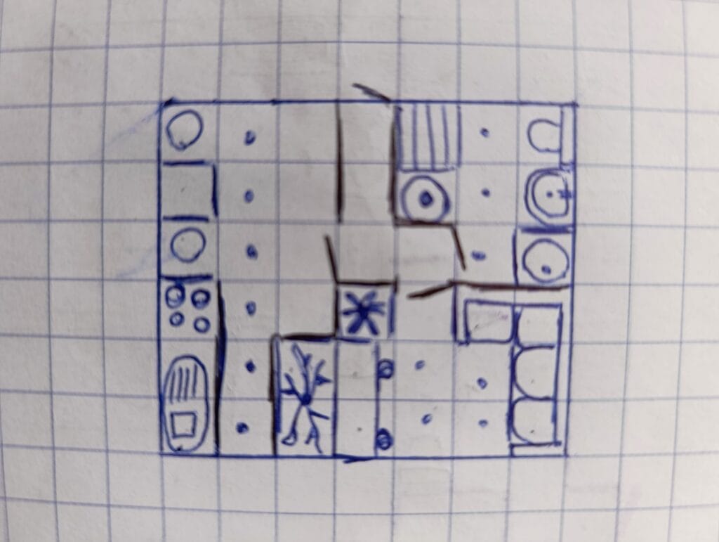 Niveau règle, le principe de base est vite expliqué : chacun notre tour nous allons dévoiler un des meubles à placer. Chaque carte meuble propose deux aménagements différents, le joueur actif impose celui à positionner sur notre feuille à petits carreaux. Il y a les cases occupées par notre meuble, et des points d’accès nécessaires pour pouvoir l’utiliser, mais qui eux peuvent être communs à différents meubles.