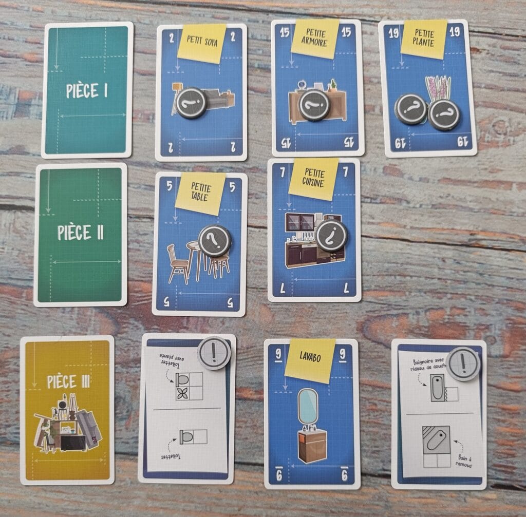 Quid si l’on refait le scénario ? Nous savons à l’avance qu’elles vont être les alternatives possibles ? Et ben non, car chaque carte meuble est prévue en deux exemplaires différents, soit quatre positionnements possibles très différents les uns des autres. Une excellente idée qui amène ce petit plus d’aléatoire qui évite de pouvoir anticiper les meubles à venir quand on connait le jeu.