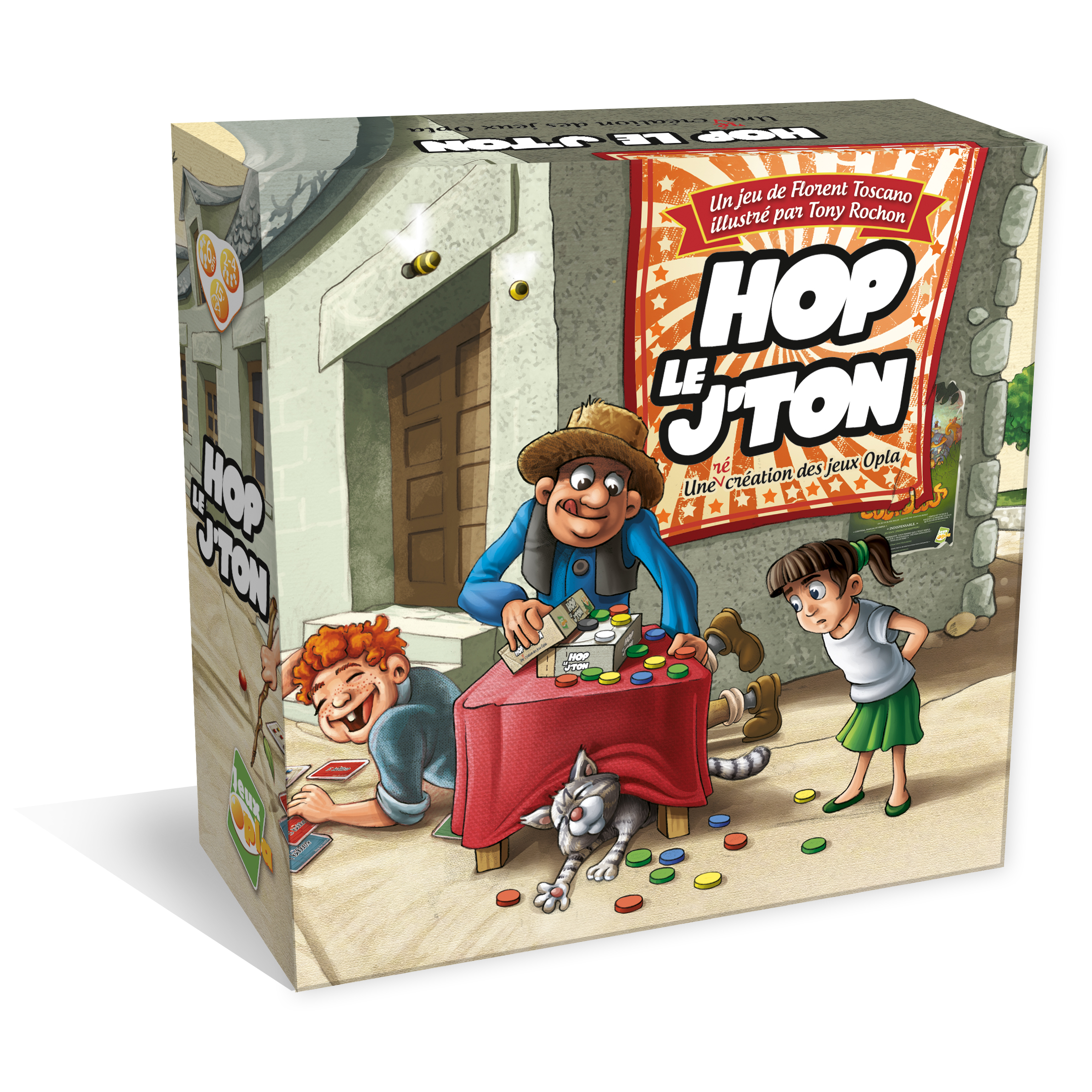 Comme tous les jeux de la gamme Hop’la, Hop le j’ton est un souvenir d’enfance de son auteur, Florent Toscano, transposé en jeu de société rien que pour le plaisir de nos yeux (il nous en avait d’ailleurs parlé à l’occasion des Rencontres Ludiques 2016, souvenez-vous).
