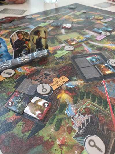 Les autres jetons sont sur les différents lieux du plateau de jeu et il faudra les révéler pour trouver, par déduction, les deux écartés. Le tout en un nombre réduit de tours et avant de se faire submerger par les vagues de monstres.
