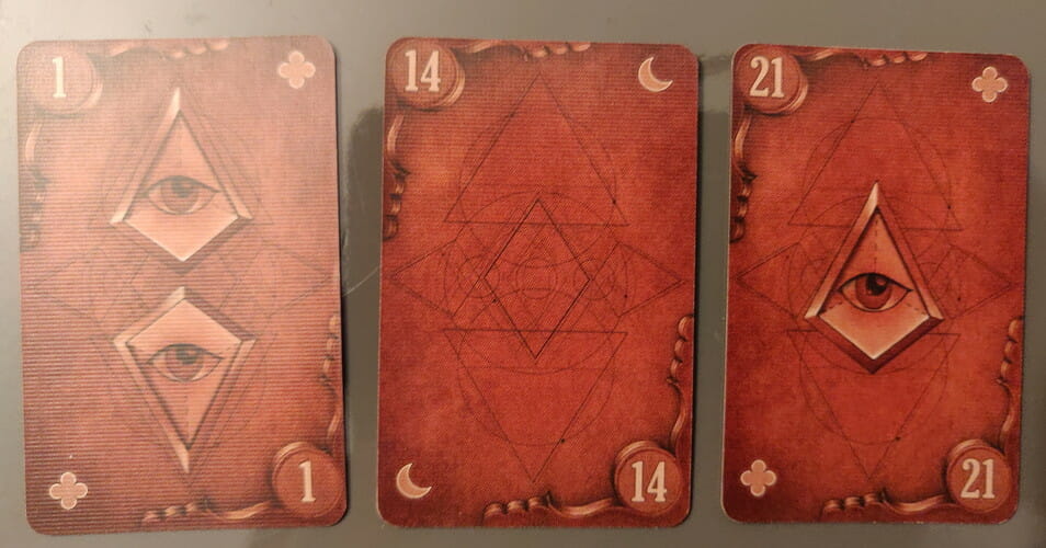 Pour réussir à stopper le rituel, les investigateurs vont devoir résoudre une sorte de Mastermind simplifié. Dix indices de 2 x 5 symboles différents définissent l’énigme à percer. Deux jetons indices sont isolés et cachés en début de partie, il s’agira des symboles à deviner.