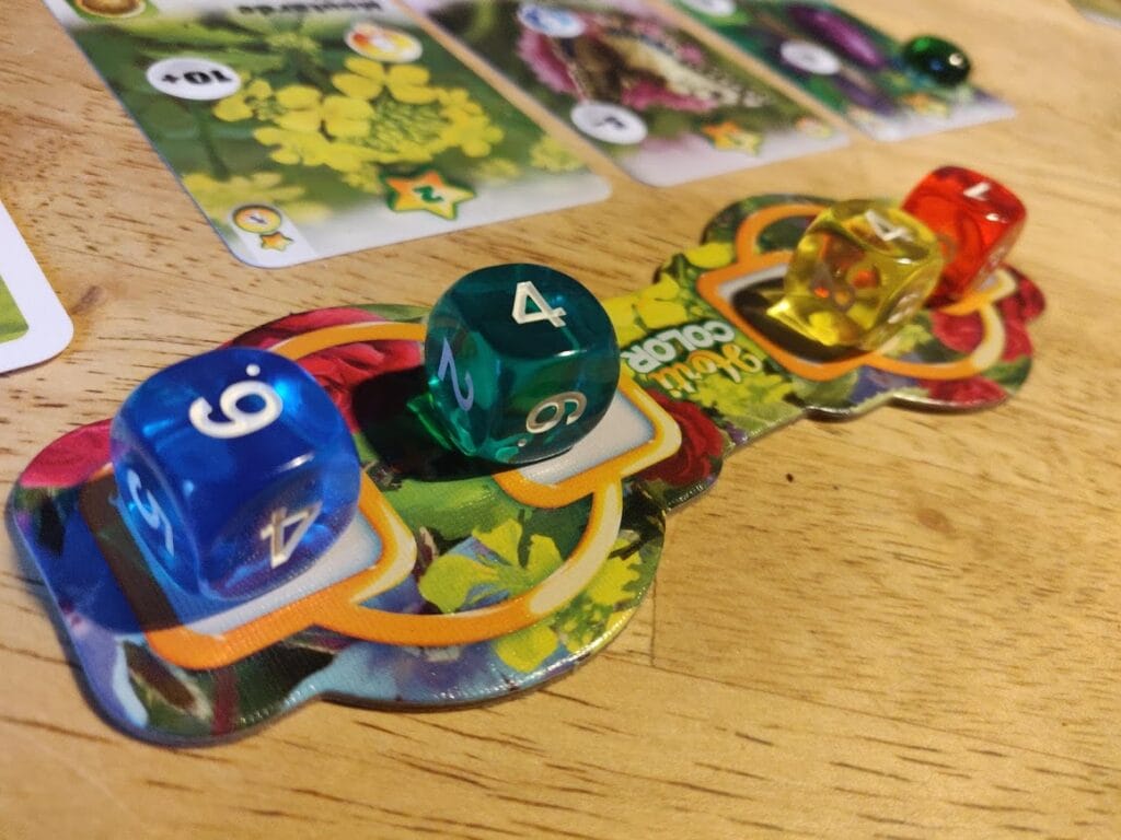 Le jardinier actif va faire deux groupes de 2 dés, de manière à faire deux sommes. Les sommes obtenues vont lui permettre de valider les conditions de ces cartes. Par exemple, un 8 bleu peut s’obtenir avec la somme de deux dés (5 & 3) dont un des dés est de couleur bleu. Bien agencé, le jardinier actif ainsi pourra valider deux conditions de ses cartes. Les autres joueurs pourront aussi profiter d’une des deux combinaisons proposées par le joueur actif.