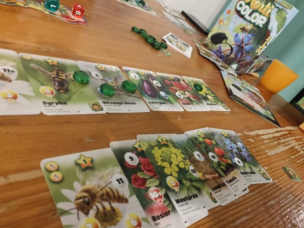 Tout cela donne un jeu harmonieux, où on sent que les bonus et capacités des cartes ont été pensés au mieux pour correspondre à la réalité botanique. Cela provoque néanmoins un petit bémol sur la faible répartition de certaines espèces pour les synergies entre cartes. Par exemple, les pollinisateurs sont présents en 12 exemplaires dans les 72 cartes, alors que les pucerons et escargots ne sont présents que … 2 fois et ne rapportent unitairement que 0 point, ainsi qu’un très mauvais score de multiplicateur …