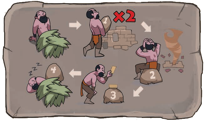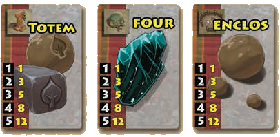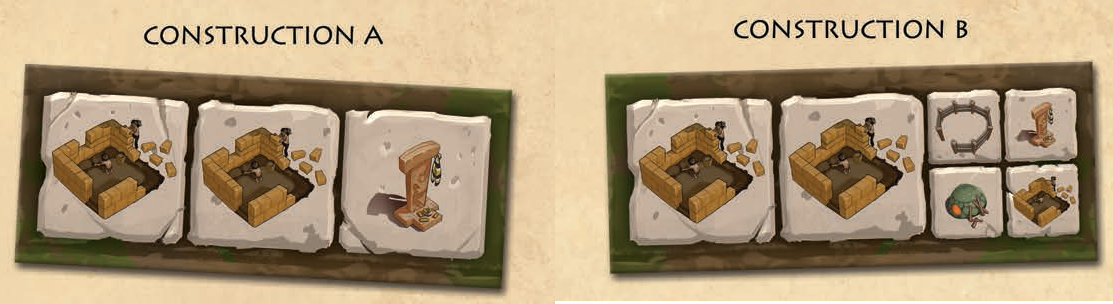 Sur l’exemple A nous devons construire 2 maisons et 1 totem, sur l’exemple B en plus des 2 maisons nous pourrons (au choix) construire un enclos, un totem, un four ou une 3ème maison.