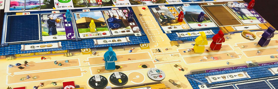 Nos mois (= tours) sont toujours rythmés de la même manière : La piste d’incendie définit l’ordre du tour, et, dans cet ordre, chaque joueur va pouvoir choisir le nombre de déplacements qu’il souhaite réaliser sur le marché. Nous allons soit percevoir notre revenu de 4 mons (l’argent de l’époque), soit recruter une carte personnage parmi celles présentes et la placer dans une des salles du marché. Ensuite, nous réalisons notre déplacement avec notre gros Meeple Oyakata, jouons l’action du quartier où il arrive, ainsi que l’action de la carte d’un personnage présent (qu’il soit à nous ou à un adversaire).