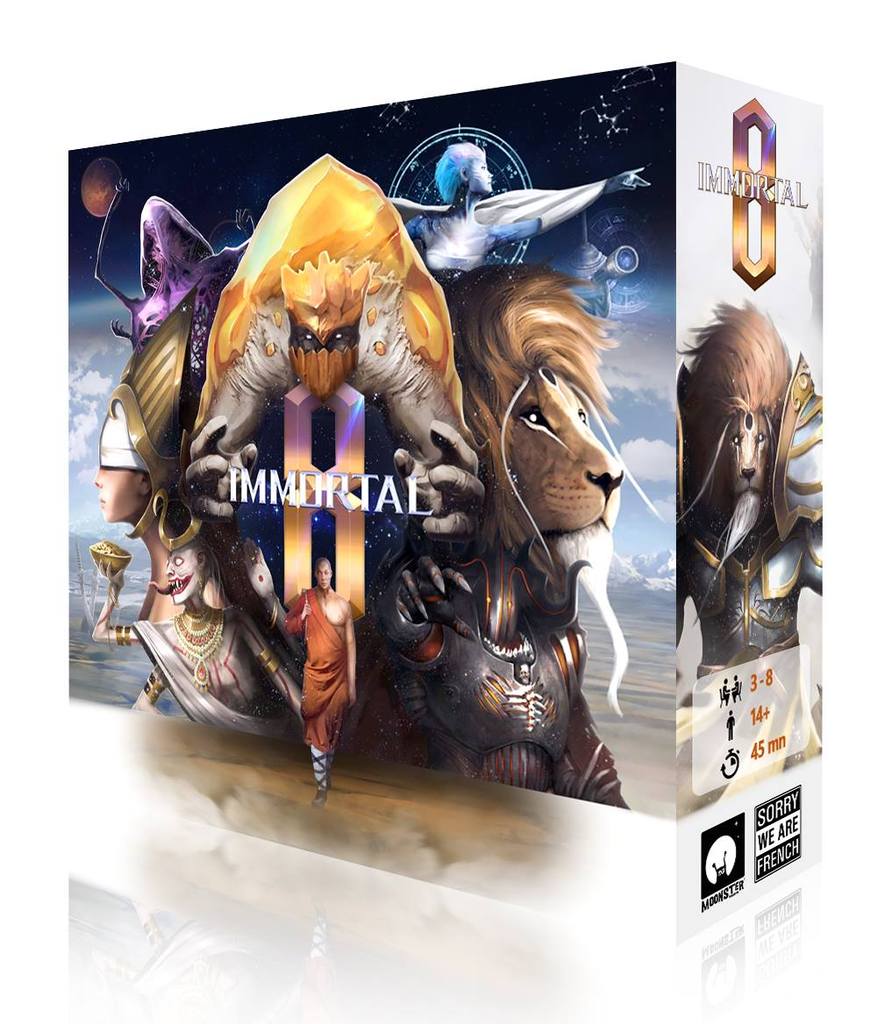 1) Le gros projet du moment est Immortal 8 (ci-contre), un jeu de draft et de civilisation pour 3 à 8 joueurs créé par Manu et axé core-gamer. La campagne Kickstarter est prévue pour début mars, avec une livraison prévue pour septembre 2018 (le jeu est terminé).