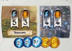 Dans Immortals, quand une bataille explose dans une région, nous plaçons les cubes des deux belligérants dans la tour : si par exemple trois cubes bleus et deux rouges tombent, les deux cubes bleus et les deux cubes s’annulent et on place le survivant (bleu) dans la région. Les cubes verts sont les cubes des habitants et selon la carte jouée, ils seront dans le camp de l’attaquant ou du défenseur.