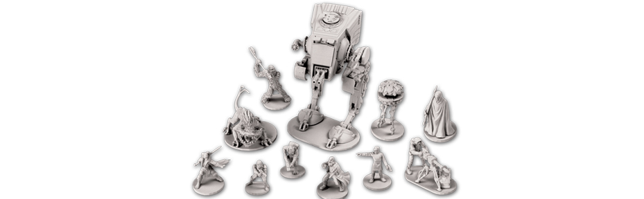 De la même façon qu’avec Descent, vous allez avoir des tuiles de terrain, des figurines en plastique (ou des jetons, ou des jetons que vous pourrez remplacer par des figurines en plastique si vous acheter les packs – pour info les Luke Skywalker Ally Pack et Darth Vader Villain Pack sont inclus dans la boite de base – ), des dés, des fiches de perso…