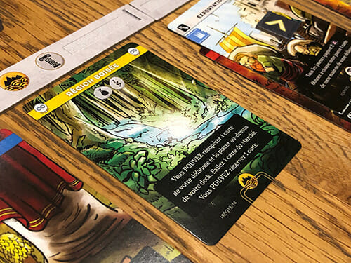 L’autre gros problème de ce type c’est qu’à la fin de chacun de nos tours, il faut mettre un jeton point de victoire sur une des cartes du marché, ainsi plus une carte reste longtemps plus elle devient intéressante. Pour certaines civilisations, c’est même crucial car l’accumulation de ces points est leur stratégie vers la victoire. Sauf que l’on oubliera tout le temps de le faire : on vient de finir notre tour, ça aura peu d’influence immédiate, cela demande de la réflexion supplémentaire, le joueur suivant sera pressé de jouer… En particulier le dernier joueur : comme il y a des effets qui se déclenchent à chaque tour de table, une fois que tout le monde a joué, ce joueur-là sera tout de suite dans une autre phase du jeu. C’est dommage car ce mécanisme a pourtant un fort impact sur le déroulement de la partie et sur l’interaction entre les joueurs. Il faudra donc y être très attentif, mais ce n’est donc pas toujours évident.