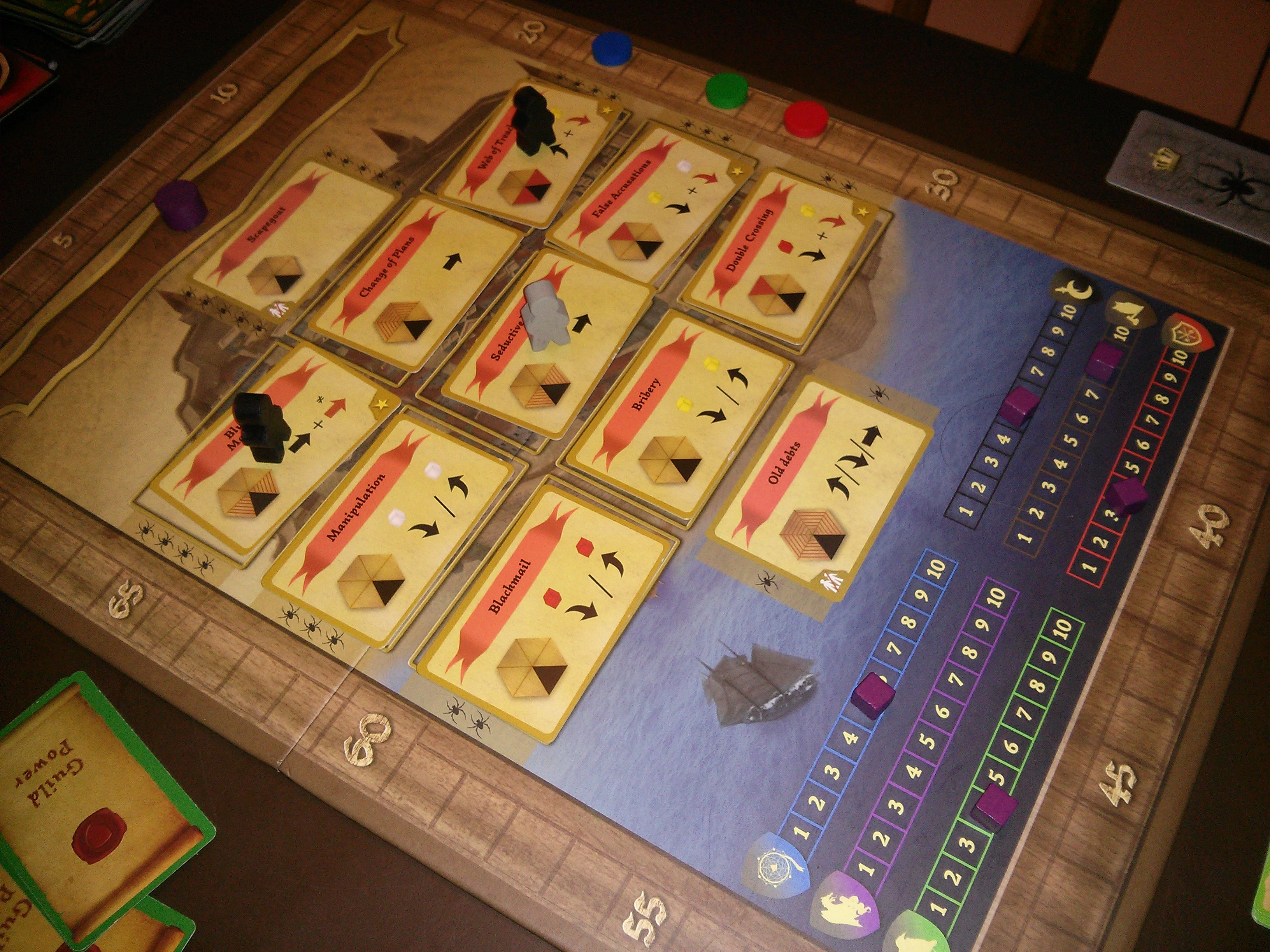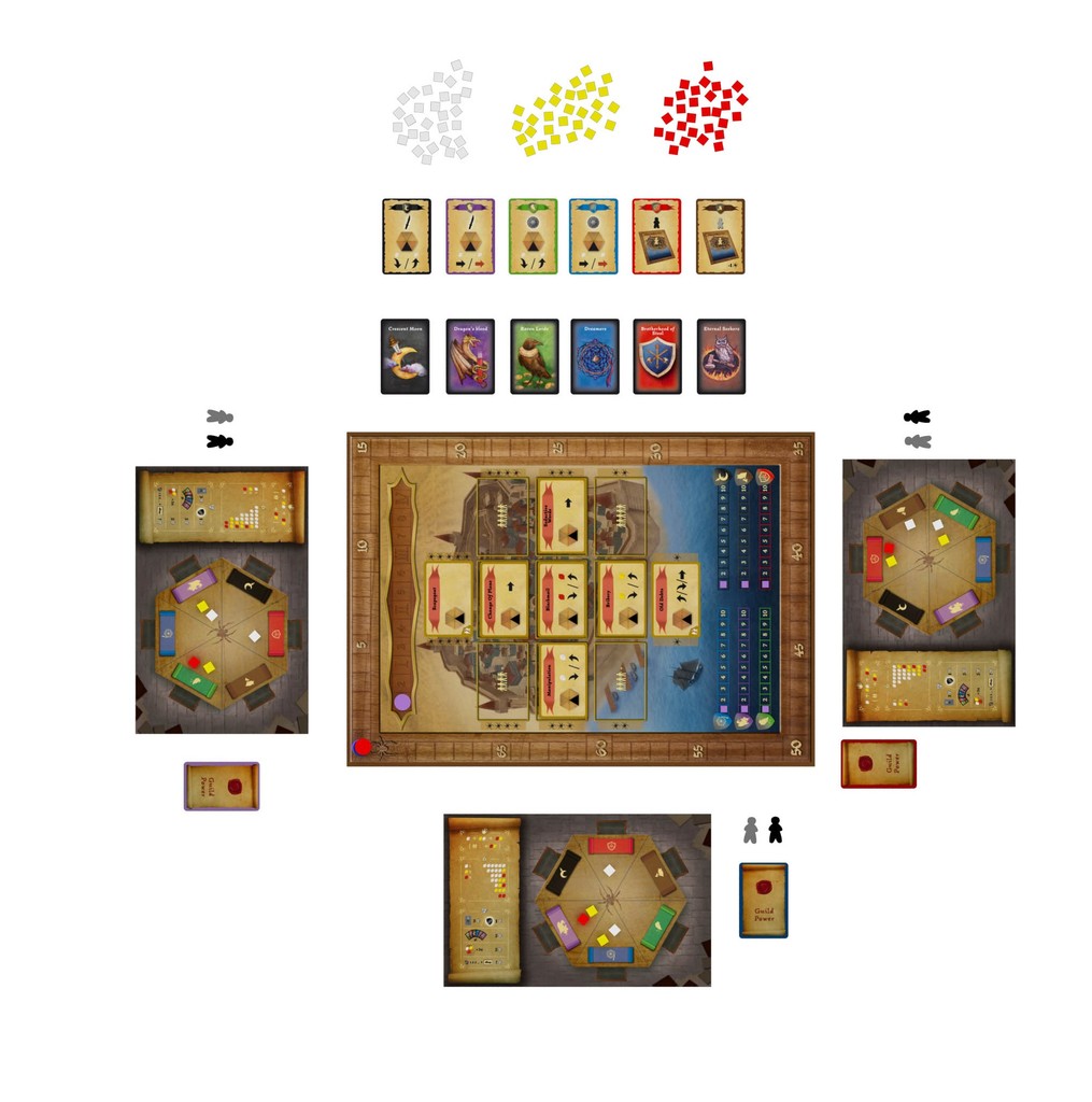 Un plateau central va présenter la dizaine d'actions possibles qui va consister à poser/déplacer/enlever des cubes sur les emplacements guilde des plateaux de jeu.