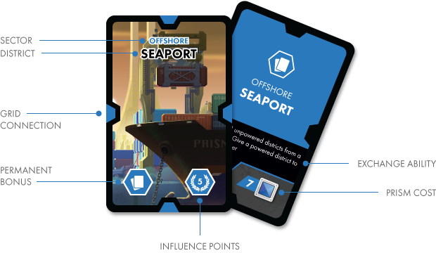 – L'activation d'une carte district permet de développer vos capacités de réseau électrique et d'augmenter votre influence. Il faudra payer en cartes prism, autant que le district en nécessite, c'est-à-dire être capable de défausser des cartes prism avec le même symbole et la même couleur en quantité suffisante !