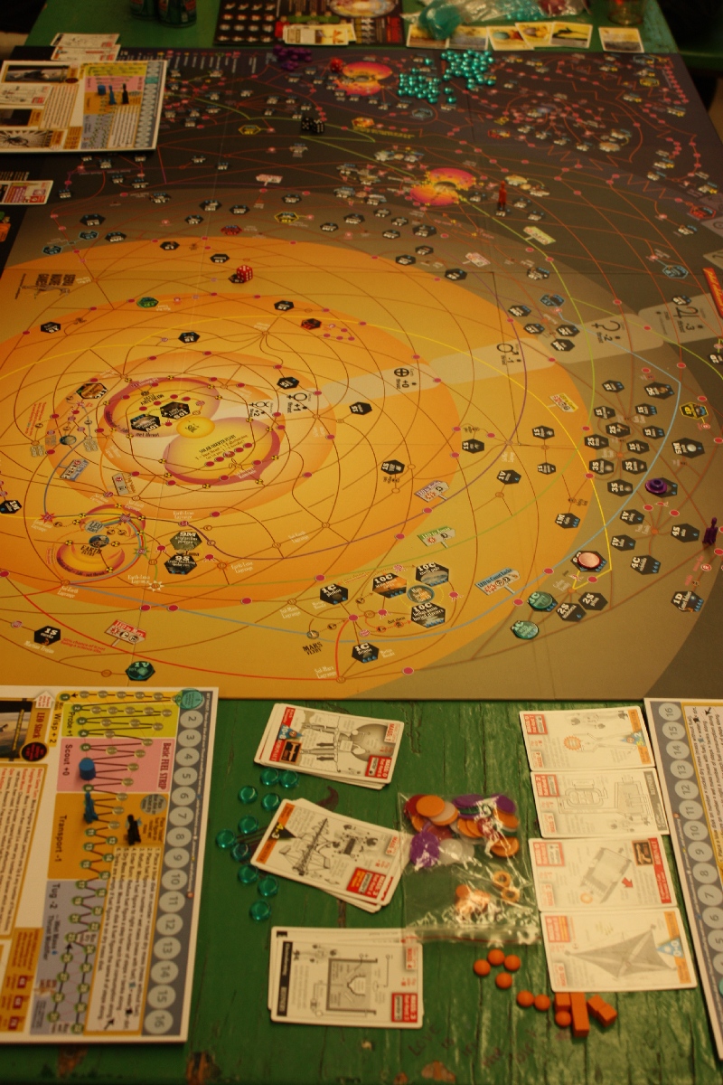 Le jeu contient un vraie débauche de matériel. 4 plateaux joueurs + 4 plateaux pliables parfaitement réalisés, mais trop gadget à mon gout. À cela s’ajoutent 7 couleurs de Meeple différents et pas moins de 19 ressources différentes à transformer en points dans la partie !