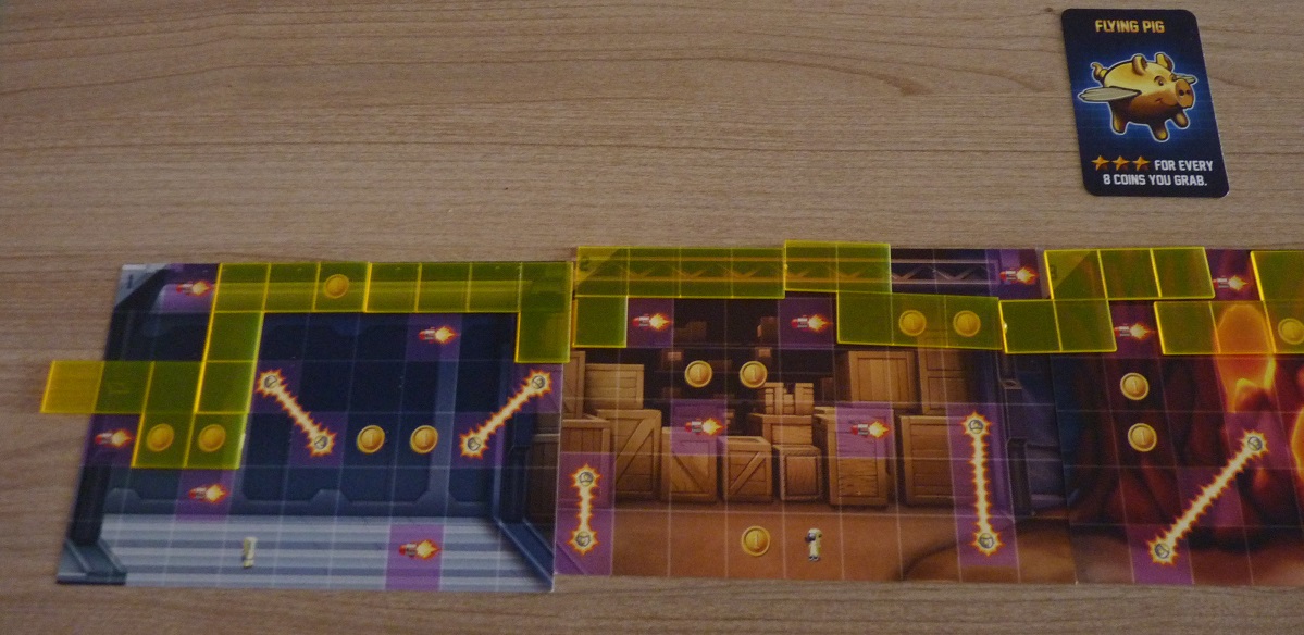 Cependant, afin de mener notre Barry à bon port, il faudra s’assurer de créer un parcours évitant les obstacles, et possédant un début et une fin. En effet, la première tuile devra être posée à cheval sur le bord gauche du plateau (le lieu où Barry a découvert le jetpack) et les suivantes devront former une route continue jusqu’au bord droit du plateau. Ainsi, le dernier carré de la sortie de tuile devra être adjacente au premier carré de l’entrée de la tuile suivante.
