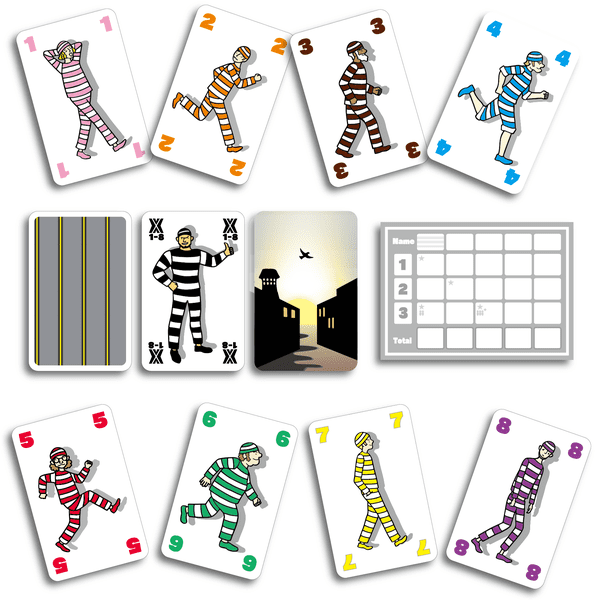 Plus précisément, à partir d'un jeu de cartes numérotées de 1 à 8, les chefs ayant une valeur de votre choix lorsque vous les jouez, chaque joueur commence avec une main de douze cartes et cinq cartes sont distribuées au hasard, face visible, dans la « cellule », une zone située près du jeu.