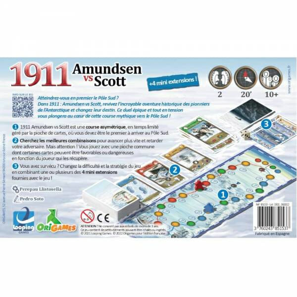 1911 : Amundsen vs Scott est une course asymétrique, avec un temps limité géré par la pioche de cartes, où vous devez être le premier à arriver au Pôle Sud. Cherchez les meilleures combinaisons pour avancer plus vite et retarder votre adversaire.