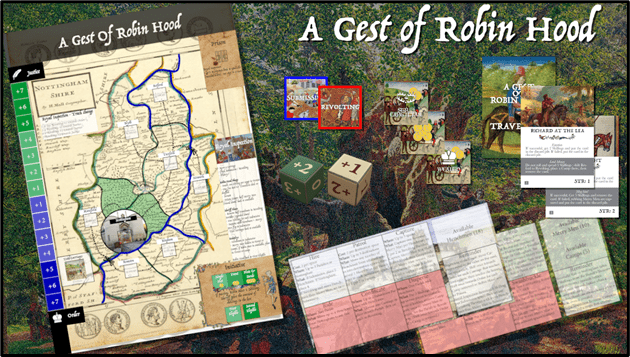 A Gest of Robin Hood est le deuxième jeu de la série Irregular Conflicts, qui adapte le système COIN pour décrire les révoltes paysannes, la collecte des impôts féodaux et les activités des hors-la-loi dans l'Angleterre médiévale de la fin du 12ème siècle. La transposition de l'un des systèmes les plus populaires de GMT dans un format plus simple et un cadre plus accessible rend A Gest of Robin Hood parfait pour les nouveaux venus dans le wargame. En même temps, il offre également un défi serré pour les wargamers plus expérimentés qui peuvent apprécier un duel asymétrique tendu en moins d'une heure.
