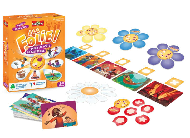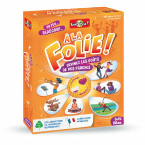 Dans ce jeu coopératif, les joueurs dès 8 ans tentent de deviner les goûts de leurs proches. En famille ou entre amis, au petit-déj’ ou à l’apéro… Dans À la folie, révélez-vous au travers de 112 situations et découvrez des facettes méconnues et surprenantes de la personnalité des autres joueurs !