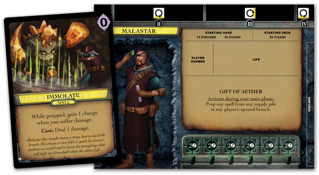 Leeching Agate, une gemme qui offre une charge ; Scrying Bolt, sort qui vous permet de défausser une charge pour réorganiser les deux cartes du dessus du deck d’ordre du tour ; Radiance, sort qui fait piocher vos alliés lorsqu’il est lancé ; Blaze, sort que vous pouvez acheter pour un autre joueur et qui devient plus puissant si d’autres Blaze sont préparés ; Temporal Helix, relique permettant de lancer un sort sans le défausser ; Sage’s Brand, sort qui occupe 2 brèches et vous fait piocher une carte en fin de tour s’il est préparé et Molten Hammer, relique vous offrant une charge et la possibilité de détruire la carte du dessus de la défausse de n’importe quel joueur ou une carte de votre main.