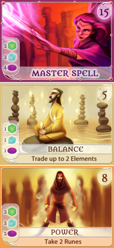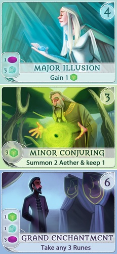 Chaque tour, vous allez convoquer de l'Aether supplémentaire pour développer vos pouvoirs de transformation et faire du commerce d'Elements et de Runes avec les autres Mages afin de gagner ce qui vous manque.