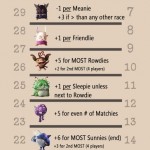 La façon de marquer des points est ce qui rend les choses intéressantes parce que chaque de type de carte score différemment, par exemple, les sleepies vont marquer un point chacun, à moins qu'ils soient à côté de voyous là ils marquent rien. Les amicaux vous feront gagner un point pour chaque tandis que les meanies déduiront un point pour chaque et les matchies vous font marquer 5 points si vous en avez un nombre pair. etc...