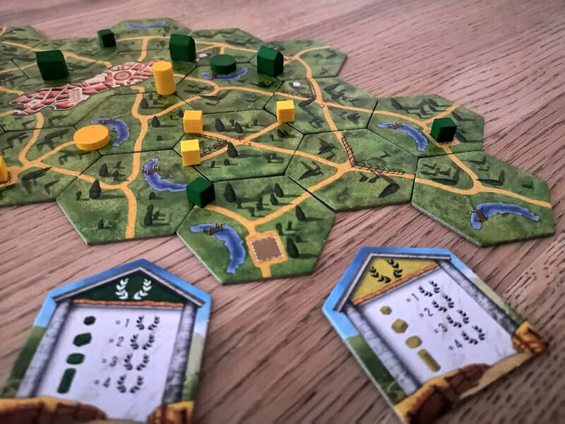 Chaque joueur commence avec un ensemble de jetons de structure en bois et une main de quatre tuiles. À votre tour, jouez deux tuiles et assurez-vous que toutes les routes mènent à Rome, puis tirez deux tuiles de remplacement. Placez des maisons dans les impasses formées, transformez les maisons en villas ou en thermes en les entourant de routes, et créez des monuments en encerclant les zones vides.