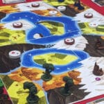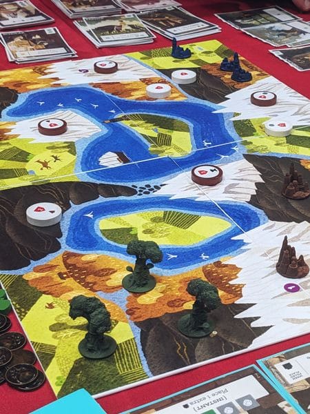 Le jeu de cartes et les extensions du plateau sont totalement intégrés, car de nombreuses cartes auront des effets plus importants si vous contrôlez les bons territoires. En utilisant les ressources produites par leurs cartes ou collectées sur le plateau, les joueurs peuvent acquérir et ajouter à leur jeu de nouvelles cartes, représentant les nouveaux colons et leur artisanat.