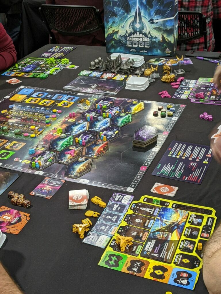 Andromeda's Edge est un jeu de placement d'ouvriers dans lequel vos ouvriers sont des vaisseaux améliorables, chacun ayant des capacités spéciales différentes. Le plateau de jeu comporte une carte hexagonale modulaire, affichant des régions de l'espace avec des actions de placement d'ouvriers et des sites à développer. Votre plateau de jeu est une base stellaire personnalisable qui vous permet de construire d'énormes moteurs de tableau en y attachant différents types de modules. Chaque joueur contrôle une faction unique avec une façon subtilement différente de jouer le jeu.