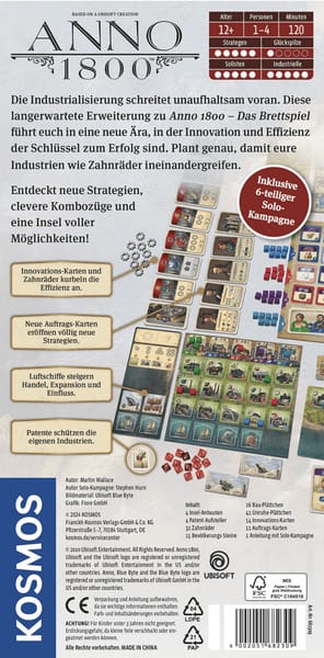 L'extension pour Anno 1800 - The Board Game fait progresser l'industrialisation et offre de nouvelles possibilités et de nouveaux coups combinés. Les cartes d'innovation et les engrenages augmentent l'efficacité, les dirigeables favorisent le commerce, l'expansion et l'influence, les brevets protègent vos propres industries et de nouvelles cartes de contrat ouvrent la voie à des stratégies entièrement nouvelles. L'extension comprend un mode solo et n'est jouable qu'avec le jeu de base. Découvrez le jeu Anno 1800 de Martin Wallace avec encore plus de possibilités et de plaisir.