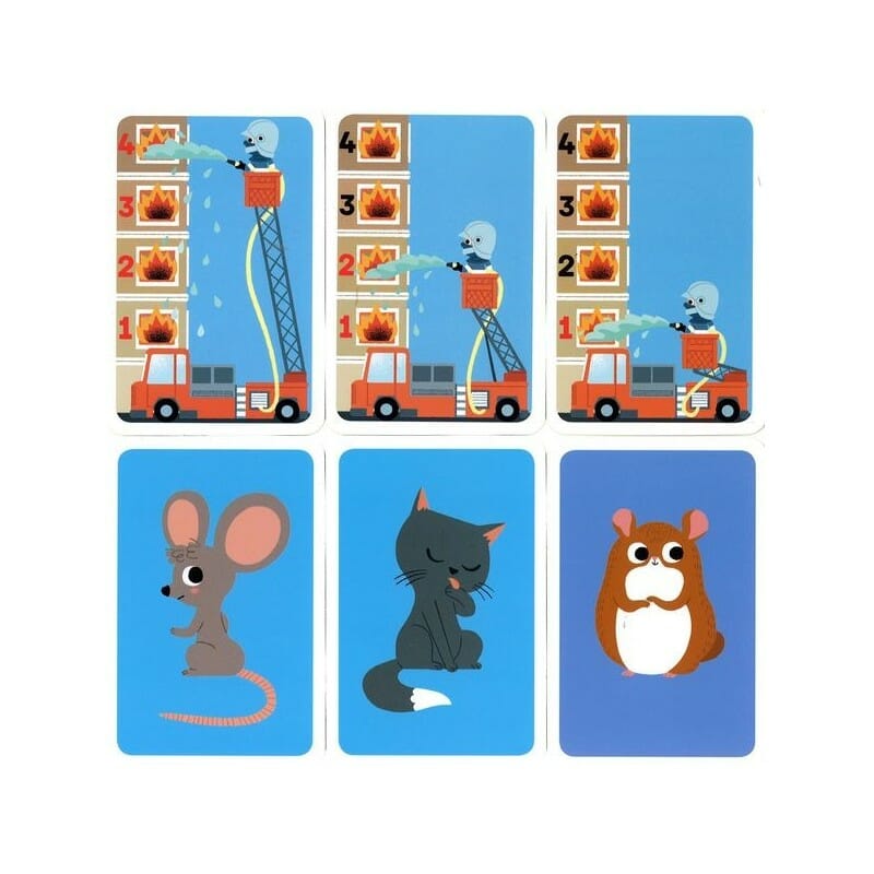 Celui qui a la plus grande échelle enlève une carte feu d'un étage égal ou inférieur à son échelle et conserve la carte (animal, réserve d'eau ou cantinier). Le gagnant est le pompier qui aura sauvé le plus grand nombre d'animaux!