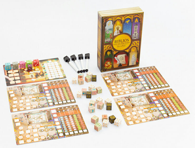 Il s'agit d'un jeu rare (si ce n'est unique) de type " roll + write " qui inclut des enchères et, contrairement à de nombreux jeux roll + write, il est très interactif. Après 8 jours, le jeu se termine et les joueurs calculent les scores. Comme dans le Biblios original, la valeur relative des livres change au cours du jeu, de sorte que les joueurs ne savent pas quels livres auront le plus de valeur jusqu'à la fin du jeu.
