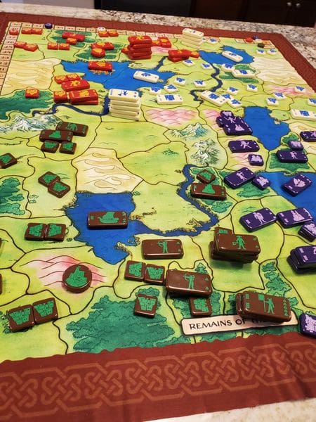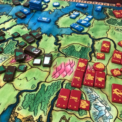 Au début du jeu, les joueurs disposent leurs tuiles en piles. Ils en tirent une main de départ de neuf. Les joueurs décident ensuite où placer leur Citadelle et quelles tuiles seront placées avec elle. Les tuiles sont à usage multiple. Lorsqu'elles sont placées sur le plateau, elles deviennent des unités, dont le type est indiqué par le symbole au centre. Lorsqu'elles sont en main, elles peuvent être utilisées pour construire d'autres unités, déplacer des unités, améliorer votre force de combat, construire des villages et lancer des raids sur des villages.
